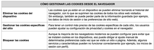 Desde este panel podrá configurar las cookies que el sitio web puede instalar en su navegador, excepto las